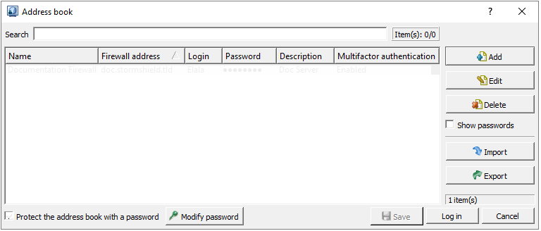 On clique sur Add puis on ajoute l’@ip externe du vpn ainsi que le login/mdp de l’utilisateur stormshield.